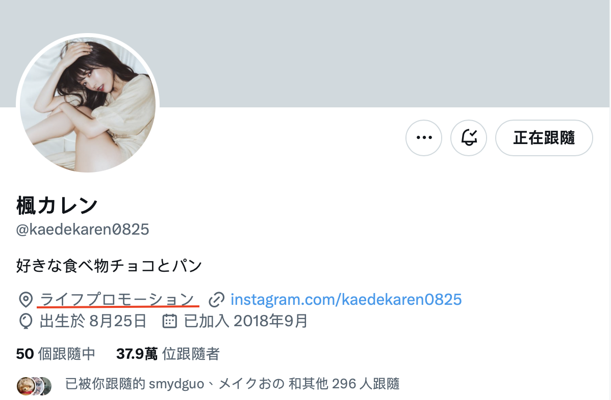 除非被盗帐号然后发文的人又正好有她穿着这件T恤的照片,否则不用怀疑,这就是枫カレン(枫花恋),而且不只这张照片,自我介绍栏那边也写的很清楚了: