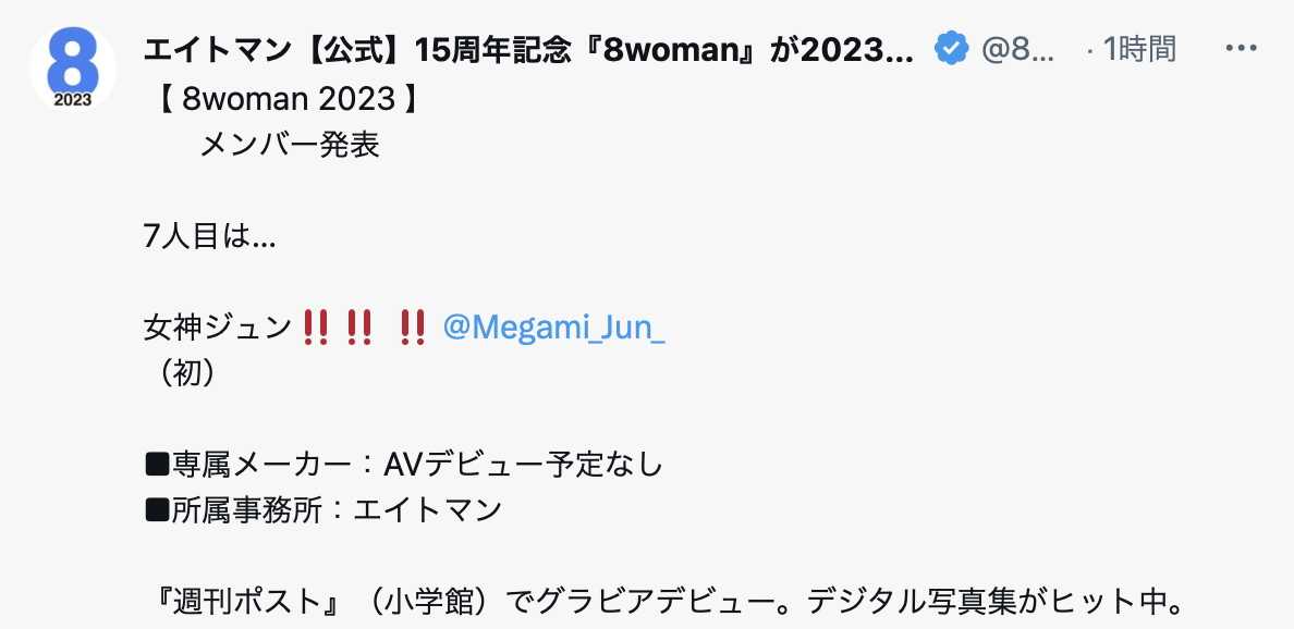 我之前是这么看8man2023的,八位女优乍看很多,但实际上8man能用的人并不多,所以他们只能一方面塑造出人人有机会个个没把握的感觉但实际上能做的变化很少很少;不过名单公布到现在蛮有意思的,前四位女优出场相信大家都会觉得不意外,但第五位用了「藤井兰々(原 蜜美杏)」我就有点疑惑了: