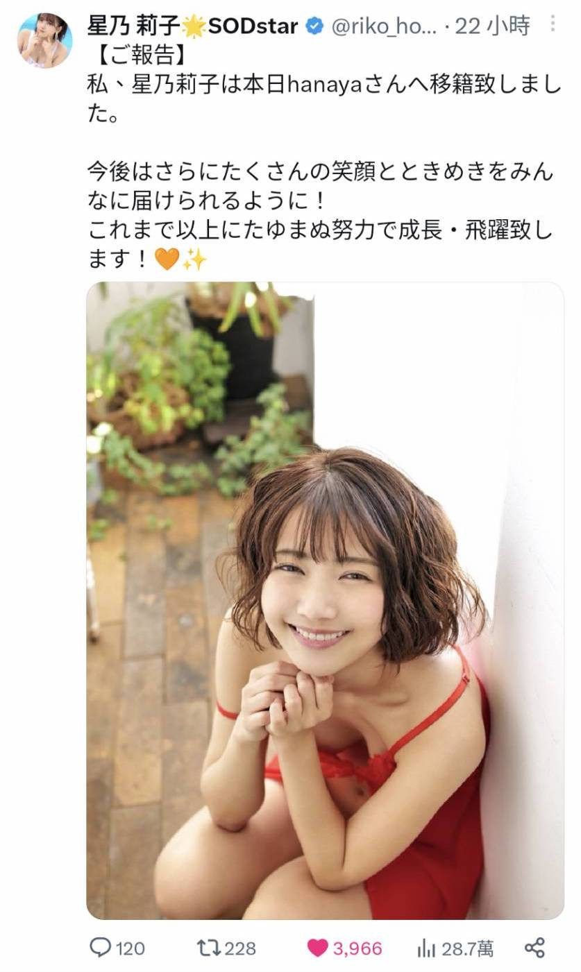 这就是为什么明明只是更换事务所的小动作我却特别拿出来写的原因,因为姫宫すみれ(姬宫蓳)写出来的东西是非常强烈的指控,我觉得有必要写出来给大家知道,至于星乃莉子的状况不会有太大变化,她依然是四小天后中的高手高手高高手,SOD STAR不会因为她换了事务所就对她不好,反而有可能因为HANAYA Project的关系对她更好!