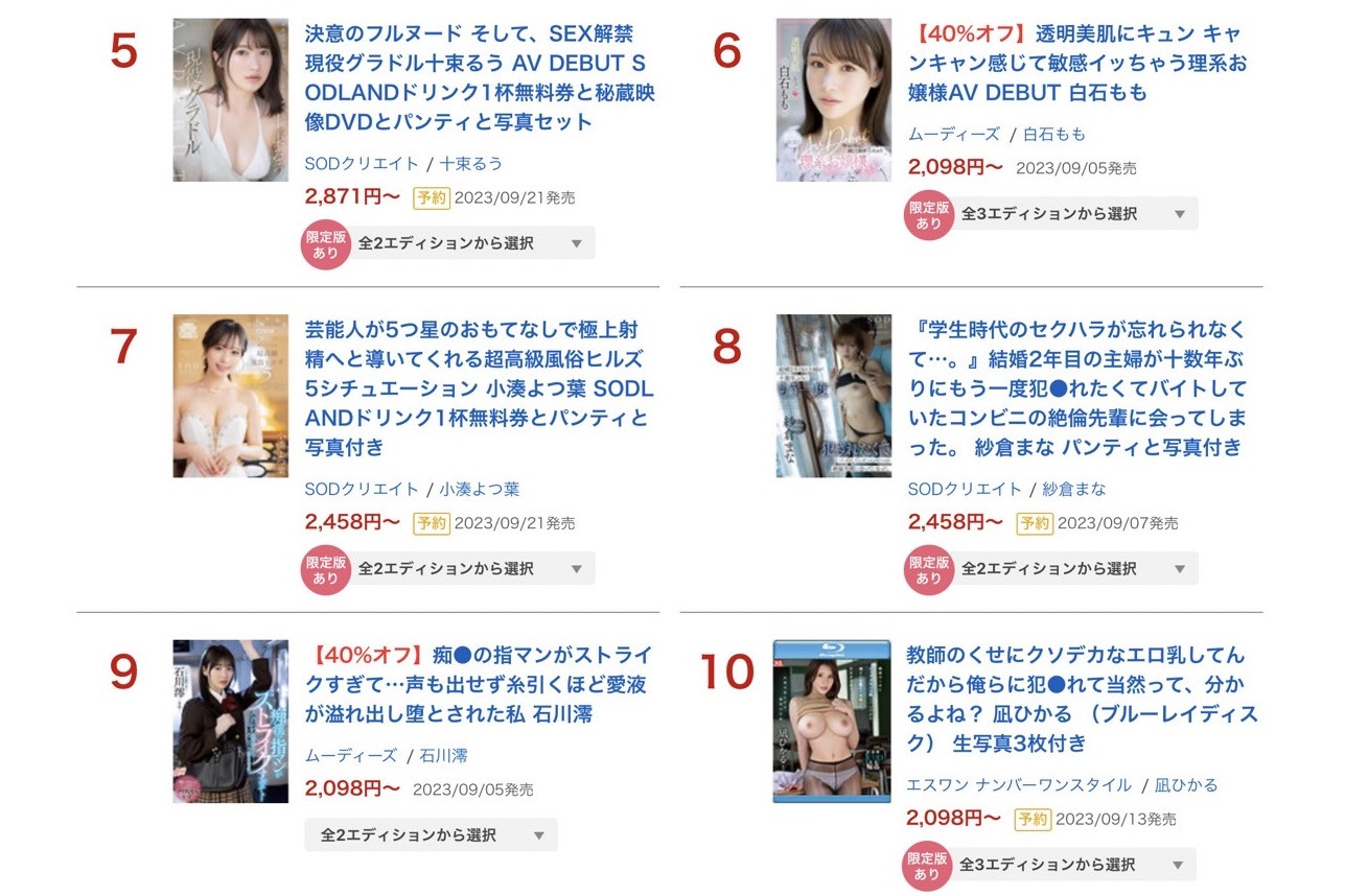 由于河北彩花的精选辑太猛,所以SOD STAR的众星们除了星乃莉子外似乎与河北彩花差距颇大,但应该可以再观察观察;而其他作品来看经纪公司ACT所属的白石もも(白石桃)的出道片「透明美肌にキュンキャンキャン感じて敏感イッちゃう理系お嬢様AV DEBUT 」表现超级棒拿下第6,告诉我们什么是初入江湖天下无敌,接下来应该可以拿到不少拍片邀约;而在TRE待在摊位的石川澪则是逐渐展现问鼎天下第二人的潜力,痴汉片「痴汉の指マンがストライクすぎて…声も出せず糸引くほど爱液が溢れ出し堕とされた私」拿下第9,累积销售的AV女优排行榜她则是高居第2,就只输河北彩花了〜