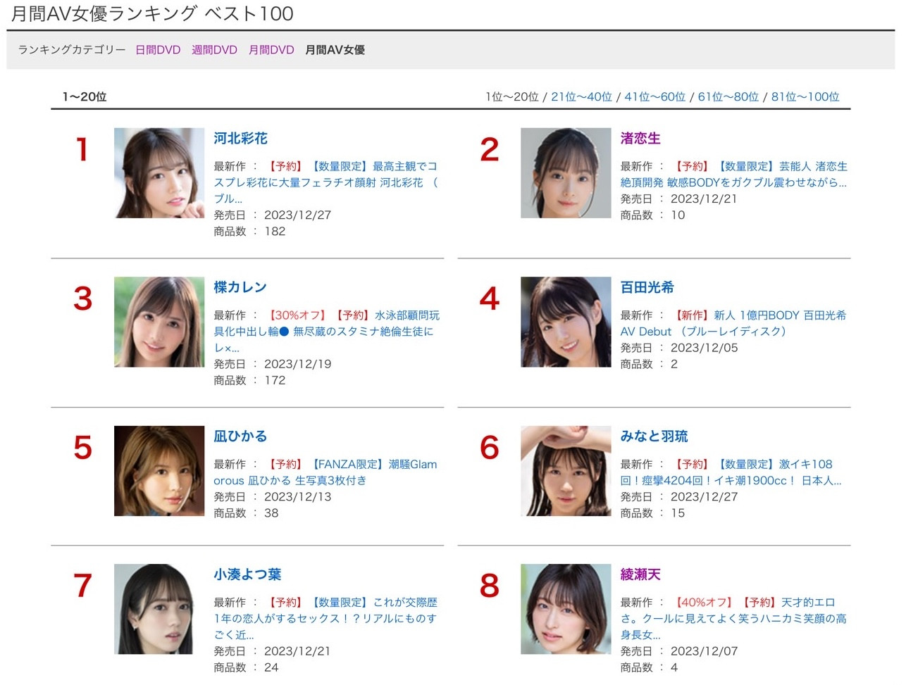 第三名的一亿円Body「百田光希」、第五名的最后大魔王「苍乃美月」、第七名偶像资历8年的「逢沢みゆ(逢泽美优)」、第八名性爱天才的「绫瀬天」、第11名比AI还强的好身材「泷本雫叶」⋯从这边你就知道上个月登场的新人有多厉害,为什么片商每个月都要推出新人?为什么事务所一直在征才?就是因为她们真的卖!