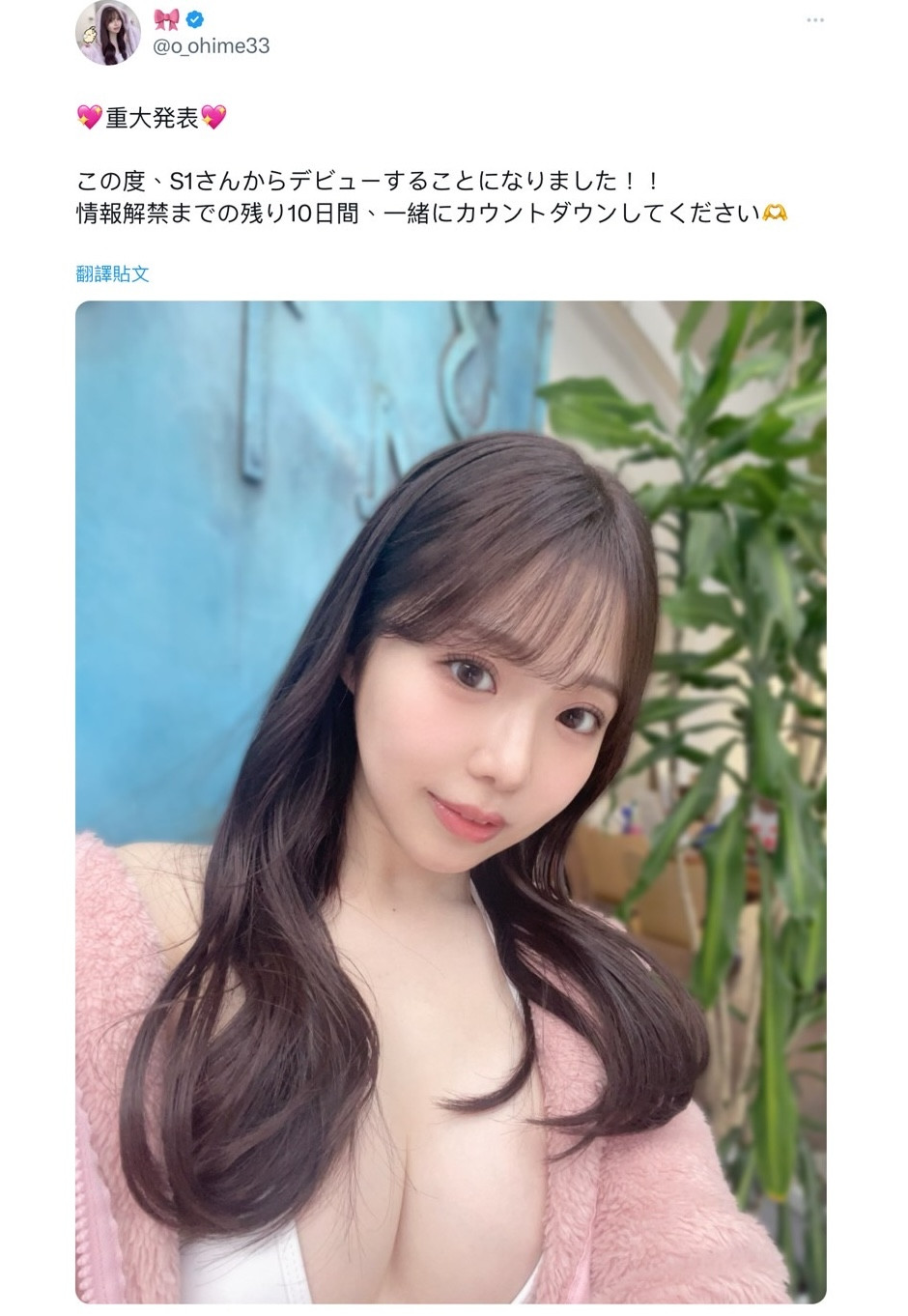 我之前猜测她会是SOD Star的人,结果狠狠地被扇了耳光,今天,她正式宣布会在最顶级片商S1出道,而S1也很快就转推她的发文,连艺名都给了: