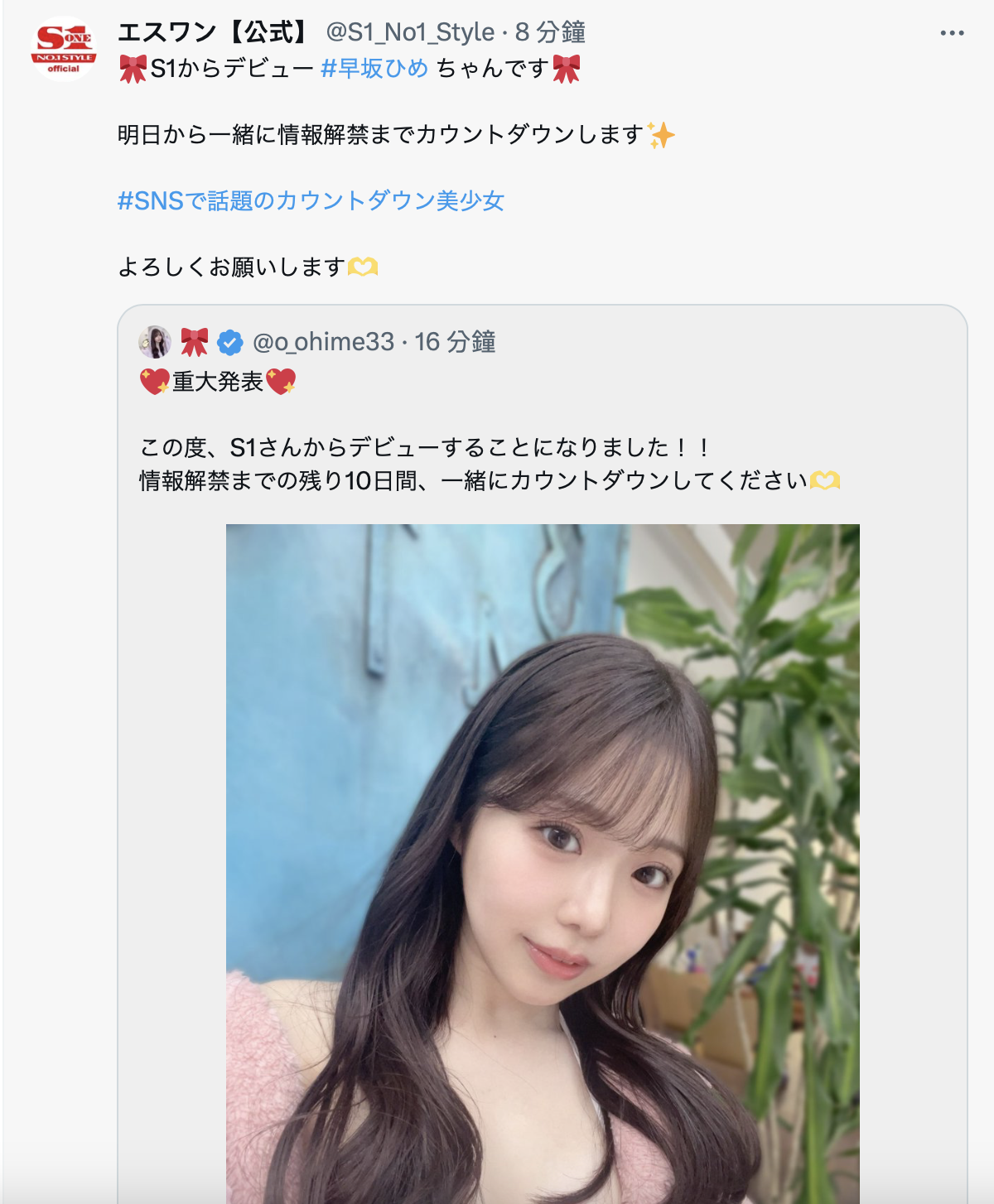 很少看到S1这么早就让新人曝光,甚至连艺名都直接给了ー这当然不是早坂ひめ(早坂姬)胆大包天急着爆料表明身分,片商一定是和事务所商量好了才公布的,我想这除了是因为AV界再过几天就要准备放年假外,也应该是因为大家都对这位女优的出场超级有信心,所以十天后、12月26日,请台湾时间早上九点钟锁定片商S1的X,让我们第一时间来看看这位「早坂ひめ(早坂姬)」的真实身分吧ー