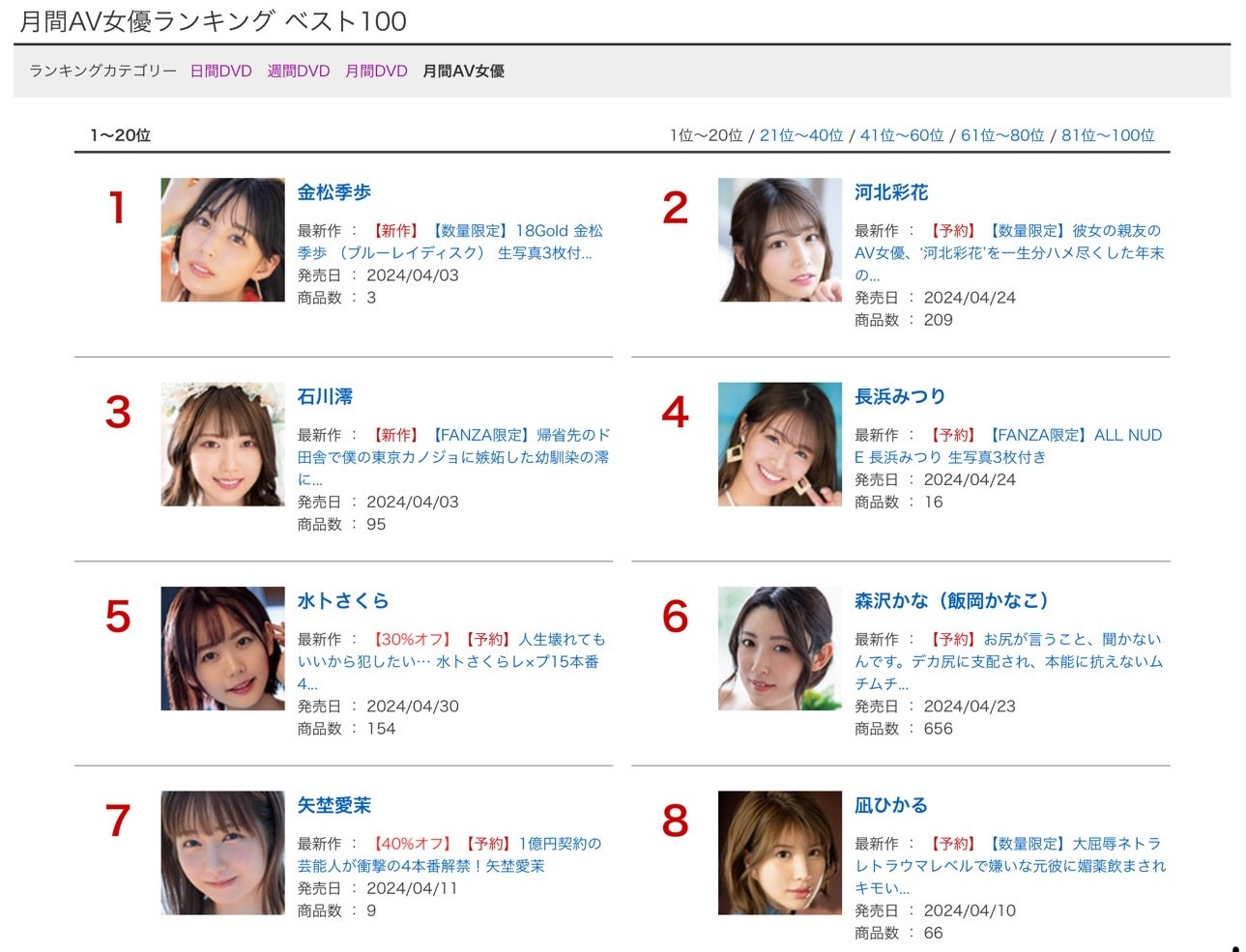 但就算这样,她还是拿下了AV女优累积销售排行榜的第二,仅次于金松季歩:为什么呢?我想可能是她这个月的作品「世界最高峰の爱人河北彩花が骨の髄までご奉仕してくれる最高の3日间」蓝光和DVD版双双入榜,三支作品加起来的总销量超过了其他女优,只输给了金松季歩〜