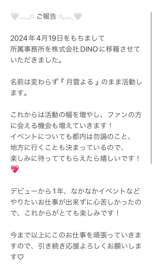 即日起,Moodyz的专属女优「月云よる(月云夜)」更换事务所为DINO!