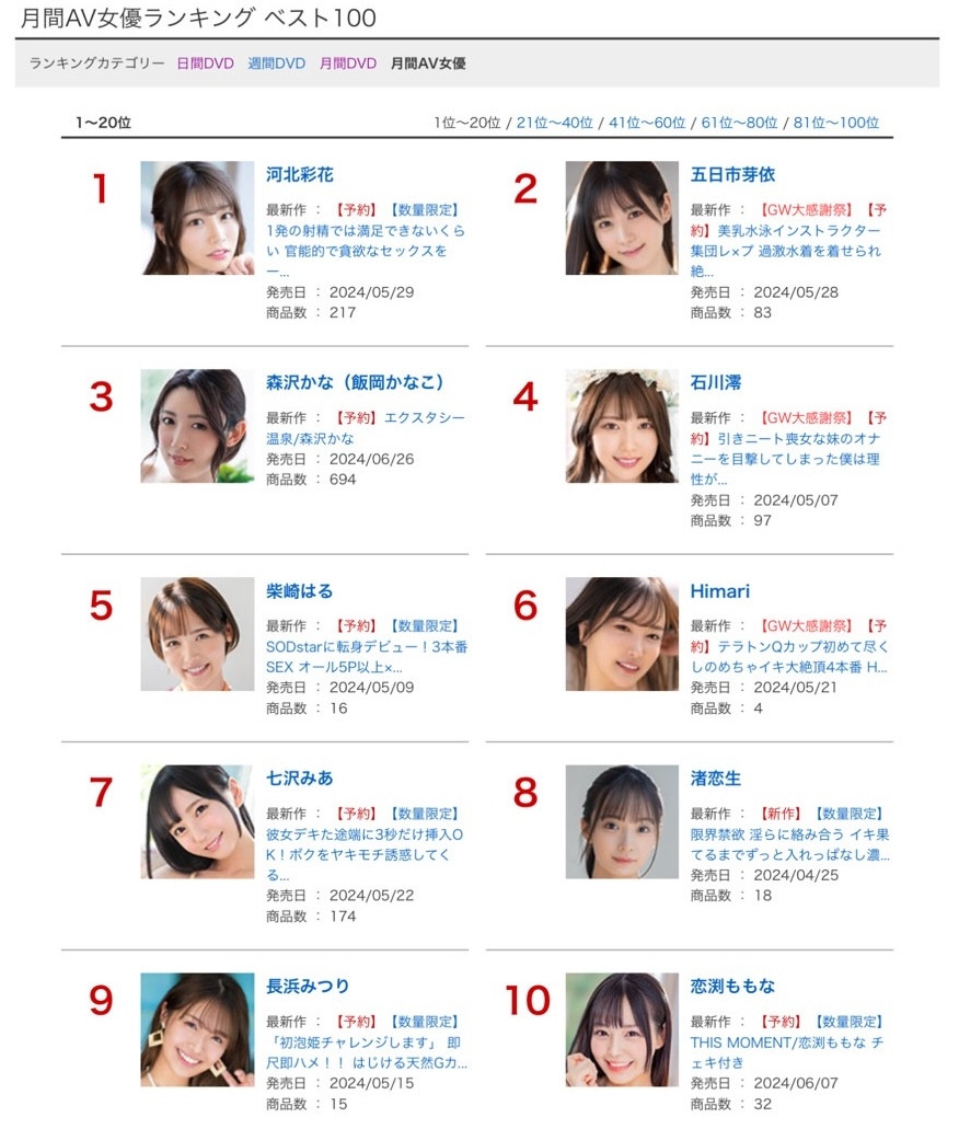 很快地,一年又过了三分之一,大家应该都感受到新人蜂涌而出的力道了,接着,我们马上来看上个月、2024年4月AV界的销售排行榜是谁称霸?