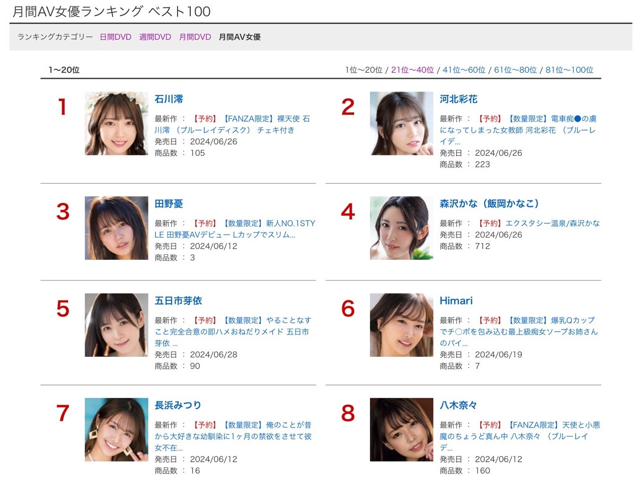 没没没,千万不要因为她掉了一名就觉得不行了,河北彩花的销售能力仍然是业界最顶尖的高手,新片「电车痴汉の虏になってしまった女教师」仍然拿下了第四,然后连男优全员连射的「1発の射精では満足できないくらい官能的で贪欲なセックスをー。」的蓝光片也打进了前20名,DVD则是第36名,这种成绩一般女优根本望尘莫及的,只能说河北就是河北,能赢她的石川也不是普通高手〜