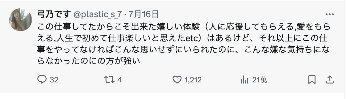 意思是「这工作(AV女优)带给我获得了像是被支持、获得爱以及觉得工作有趣的体验,但更多的是如果我没做这份工作、是不是就不会这么不快乐的感觉?」,所以从这段话来看弓乃りむ(弓乃凛梦)对自己这段AV生涯应该不是像拳王一样我的一生没有丝毫悔恨,所以ー