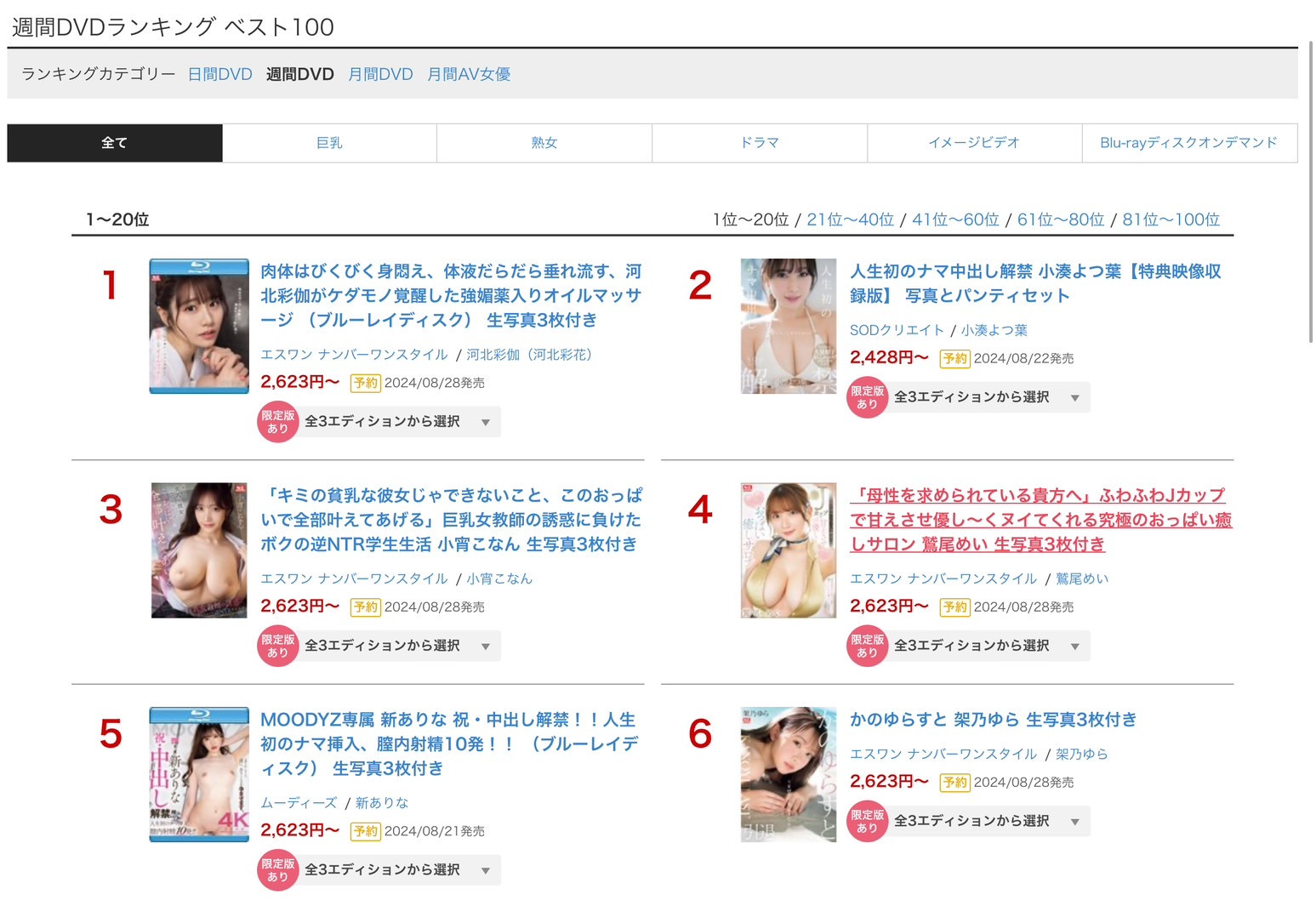 这是本周FANZA的销售排行榜。