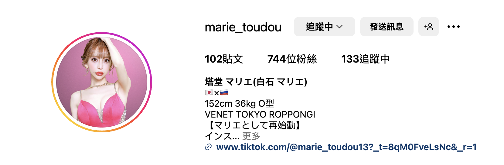 我们还是从她的自我介绍看起:大家应该都看到了「VENET TOKYO ROPPONGI」这段英文了吧?丢去Google就知道那是一家位于东京六本木的酒店,所以这些日子塔堂マリエ(塔堂茉莉绘)在做什么大家一目了然,就是在酒店当陪酒妹了;至于会不会复活AV女优的身分和大家在淫光幕上见面呢?答案也是肯定的,甚至就她本人的说法,就是为了复活所以才开始经营IG的: