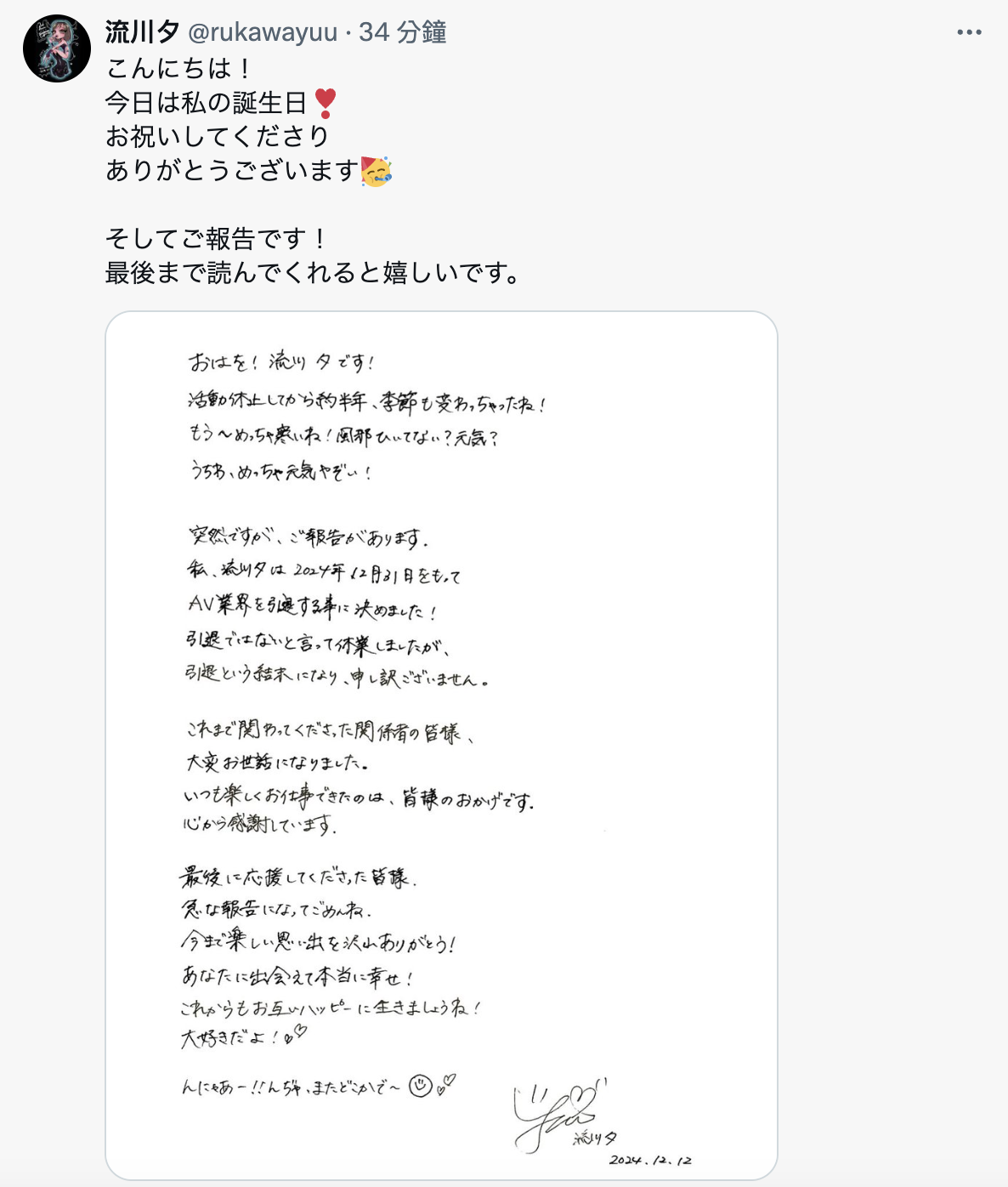 这样先休业再引退的告别方式可能会让某些朋友怀疑她的身体状况,在这里要和大家说声抱歉,由于之前山岸和美谷被八社共同封杀的缘故所以我和流川夕所属的事务所リスタープロ(LiStarPro)联络不多,之前没有打听到任何消息、看到引退声明的当下我也没打算去打扰对方,所以这边没有任何的八卦可说ー这样也好,就让我们把她最美的模样记在心中,她精致的脸蛋、她清瘦纤细的身材以及一看就知道花了很多钱去做的美甲都让人记忆深刻,谢谢她3年来的付出,我们有缘再见、无缘也祝她未来的日子幸福美满!