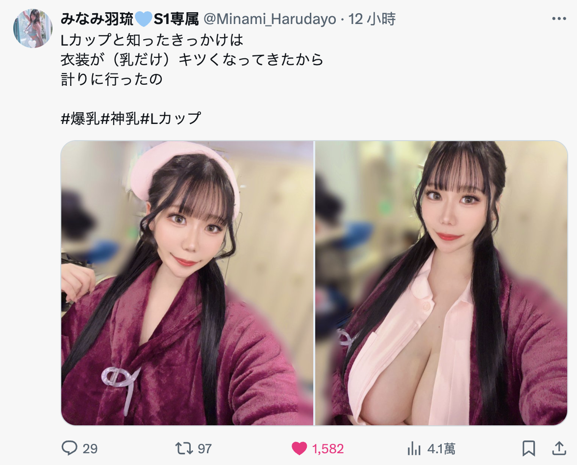 这也让みなみ羽琉(南羽琉)成为片商S1最胸的女优,到底她是与神楽ももか(神乐桃果)、鹫尾めい(鹫尾芽衣)以及凪ひかる(凪光)同样以K罩杯待在第二个领先群,但现在她追上了田野忧成为最领先族群的L罩杯,以后看她的社群可能更夸张了ー