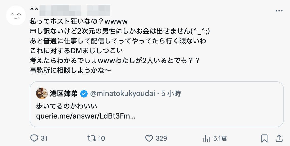 也不是每个女优都是如此的,有「美少女的天花板」之称的石川澪在被爆料会位于去歌舞伎町的牛郎店「arufuァ(Alpha)」后于X的小号发文,她是这么说的:
